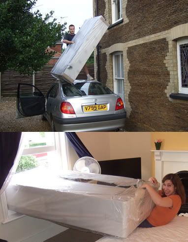 But the furniture store was having problems with their distributor & so 3 weeks later than promised- the beds arrived. (Missing Kathy's visit entirely!) So with just one day until the parents arrival, the beds were delivered. But as hard as the delivery men tried (and discussed and discussed), they could not maneuver them up the staircase. They just didn't fit. This didn't make any sense to me since we had gotten an office desk and wardrobes up the stairs. So when my loving husband got home from work, we tried getting the beds up ourselves. Still didn't fit. So what did Shawn suggest? Go through the window!